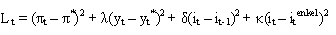 Det første leddet i ligningen representerer kriterium 1, der tapet er større jo mer den faktiske inflasjonen πt avviker fra inflasjonsmålet π*. Det andre leddet representerer kriterium 2, og viser at tapet øker jo større svingningene i aktivitetsnivået er, målt som gapet mellom den faktiske produksjonen yt og det normale produksjonsnivået yt*. Det tredje leddet representerer ønsket om gradvise renteendringer i kriterium 3, altså at renten i dag it ikke bør avvike for mye fra renten i forrige periode it-1. Det fjerde leddet representerer kriterium 4 og kan tolkes som at det også er en kostnad eller risiko ved å sette en rente it som avviker mye fra den renten som følger fra enkle pengepolitiske regler itenkel. Ved å legge noe vekt på at styringsrenten ikke bør avvike for mye fra enkle regler, kan pengepolitikken bli noe mer robust. (1)