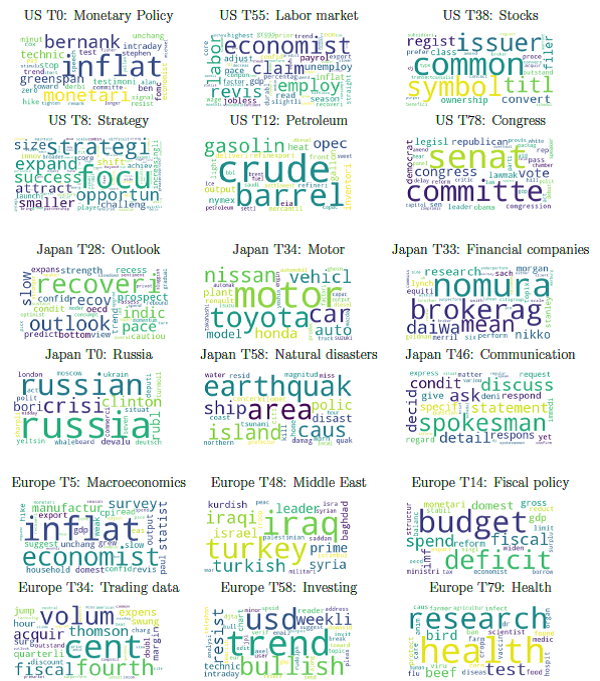 We find that three news topics have high weight in describing this piece of text. These are labeled “Outlook”, “Motor”, and “Natural disasters” (word clouds associated with these topics are shown in Figure 2 below). If many news stories have similar topic decompositions on this day, we hypothesize that these narratives signal something that can have economy-wide effects.