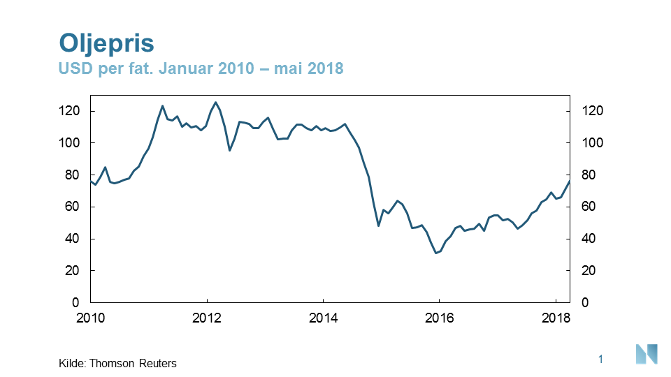 Oljeprisen er mer enn doblet siden bunnen i januar 2016. Siden sommeren i fjor har prisen steget med rundt 30 dollar per fat og ligger i midten av mai rundt 75 dollar fatet, se figur 1.