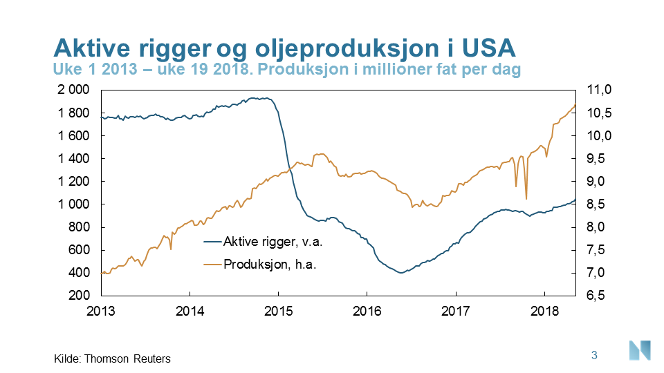 Samtidig har veksten i oljeproduksjonen i USA vært svært sterk, se figur 3. Veksten i oljeproduksjonen i USA har bidratt til å dempe presset oppover på oljeprisen fra tilbudssiden.