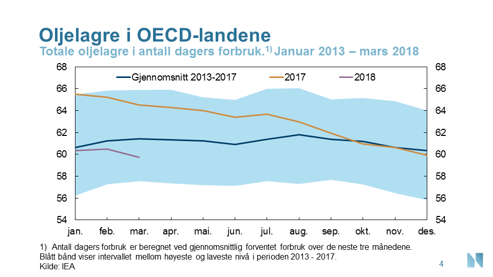 Oppgangen i oljeprisen siden februar i år synes på nytt i hovedsak å henge sammen med forhold på tilbudssiden. Det understøttes av utviklingen i den faktiske og beregnede prisen i figur 2. Prisen har steget videre så langt i mai til over 75 dollar fatet. Økningen nå knyttes særlig til at USA har bestemt å gjeninnføre straffesanksjoner mot Iran, som er en betydelig oljeeksportør. Fallende oljeeksport fra Venezuela, som sliter med store økonomiske problemer, er også viktig. Utslagene i oljeprisen kan bli store når oljelagrene har falt mye, se figur 4. Nedgangen i oljelagrene gjennom 2017 og inn i 2018 reflekterer nettopp kombinasjonen av begrensinger i tilbudet og god vekst i etterspørselen.