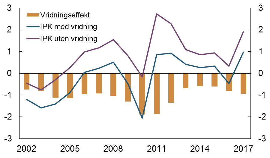 Figur 1 Indikator for internasjonale prisimpulser til importerte konsumvarer (IPK) med og uten vridning1).