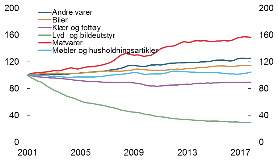 Figur 2 viser at det særlig er prisene på klær og fottøy samt lyd- og bildeutstyr som har falt siden 2001. Disse varegruppene utgjør til sammen litt over en tredel av konsumvarene vi importerer fra utlandet.