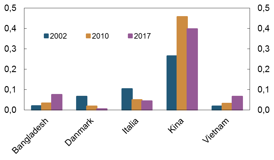 I store deler av perioden har en markert vridning av importen av klær og fottøy mot Kina bidratt til den svake importerte prisveksten. De siste årene har imidlertid importandelen til Kina falt. Det har skjedd ettersom Norge har vridd sin import mot fremvoksende økonomier med enda lavere prisnivå, som Vietnam og Bangladesh. Samtidig har importen av klær og fottøy fra industrialiserte land som Danmark og Italia fortsatt å falle. Dette er illustrert i figur 3. Prisnivåene på importvarer fra disse landene varierer svært mye. For eksempel er prisnivået i Bangladesh ifølge Verdensbanken omtrent 80 prosent lavere enn prisnivået i Danmark. Endringene i norske importandeler for klær og fottøy gir derfor sterke vridningseffekter.