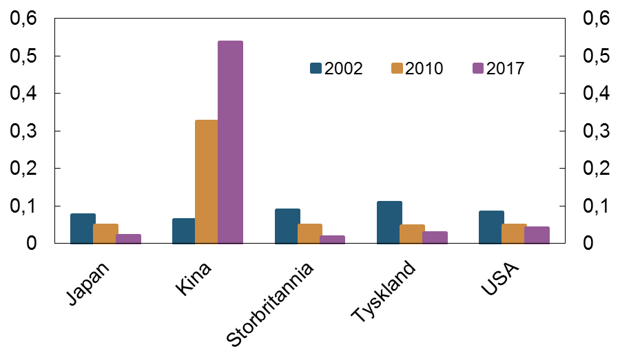 For lyd- og bildeutstyr er importandelen fra Kina fremdeles økende, se figur 4. Mye av denne utviklingen skyldes trolig fremveksten av den øst-asiatiske produksjonskjeden der delkomponenter blir sendt til Kina for montering og eksport. Hittil har importandelen fra andre fremvoksende økonomier ikke økt, og vridningseffektene har derfor vært noe lavere enn for varegruppen klær og fottøy. Det store prisfallet på lyd- og bildeutstyr som fanges opp i IPK kan i stor grad forklares med den høye produktivitetsveksten i denne type produksjon.