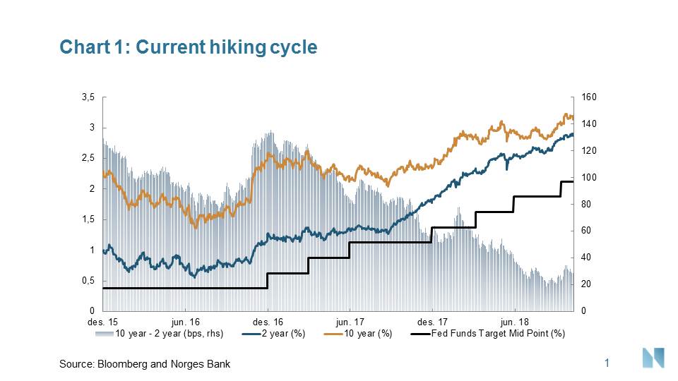 As evident in chart 1, the yield curve, from here on defined as the differential in yield between a 10-year and a 2-year US Treasury security, has flattened in this hiking cycle as short-term rates have risen more than long-term rates. As chart 2 shows, the yield curve also flattened in the previous hiking cycles. As a matter of fact, the flattening was more pronounced in the 1994-95 and the 2004-06 cycles. This is in part related to the fact that the slope of the yield curve was sitting at higher levels going into those two cycles, see chart 3. In addition, the monetary policy normalization has been more gradual this time around, resulting in a more benign increase in short-term rates than in the two mentioned previous cycles. Nevertheless, the flattening of the yield curve in all the three preceding hiking cycles goes to show that there’s nothing extraordinary with the flattening this time around. However, given that long-term rates are still relatively low in a historical context and the rise in long-term yields have been relatively benign in this cycle, the behavior of long-term rates warrants further examination.