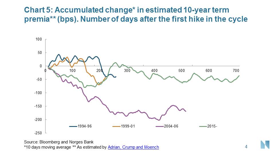 The estimated neutral level of interest rates is an important concept when considering long-term rates and the slope of the yield curve. One way to view the neutral rate is to think of it as the level of interest rates that is neither accommodative nor contractionary, i.e. a level consistent with a closed output gap. There is, due to several reasons, common understanding that this rate is lower than what was the case prior to the crisis. Indeed, as evident in chart 4, the median FOMC estimate for the funds rate over the long run has fallen dramatically over the last years, in tandem with a flatter yield curve. In other words, it’s the view of the FOMC that fundamentals dictate a shallower path for policy normalization this time around. With the zero lower bound acting as a floor for short-term rates, a lower neutral rate should be expected to flatten the yield curve in a hiking cycle as it limits the extent to which long-term yields can rise from a fundamental point of view. Hence, there are valid arguments for why this time is different and that the slope of the yield curve should be flatter in this hiking cycle compared to the past.