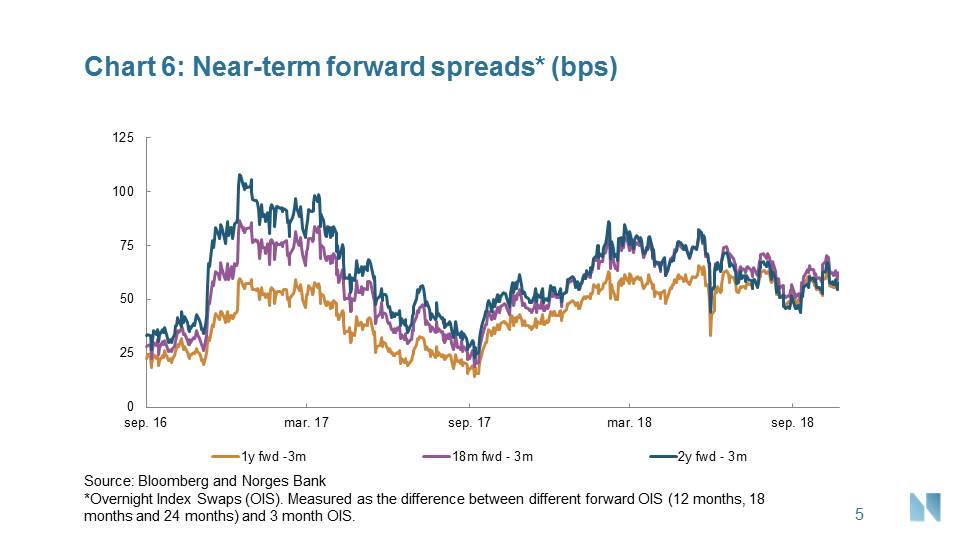 As evident in chart 6, this is not the case. On the contrary, near-term spreads are far from in inverted territory. On the contrary, the spreads are upward sloping as market participants are expecting Fed to continue with gradual increases in the funds rate over the near-term.