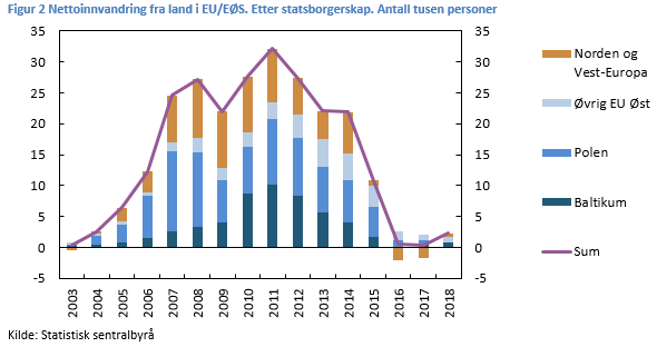 Så langt har følgelig ikke den økonomiske oppturen de siste par årene slått ut i høyere innvandring. Den lille økningen i nettoinnvandringen fra 2017 til 2018 skyldes utelukkende lavere registrert utvandring.