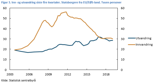 Høyere utvandring er en av grunnene til at nettoinnvandringen, slik den måles i befolkningsstatistikken, har avtatt, se figur 3. På midten av 2000-tallet forlot i underkant av 20 000 statsborgere fra EU- og EØS-landene Norge hvert år. Norske statsborgere inngår i tallene. I det siste har denne utvandringen ligget på rundt 30 000 personer på årsbasis.