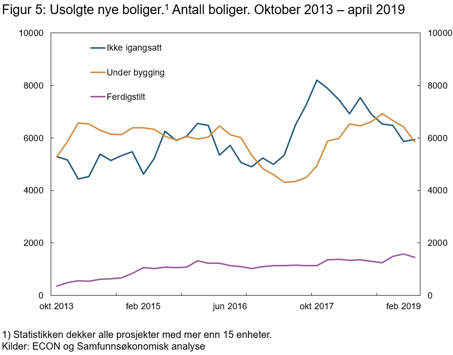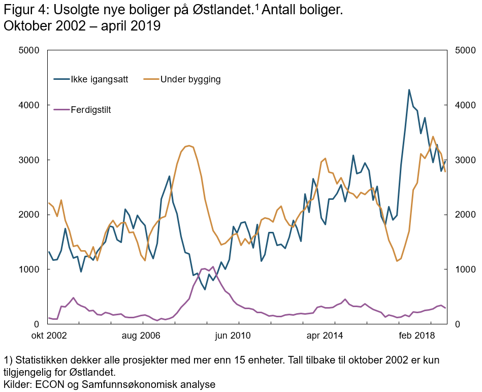 For landet som helhet har antallet usolgte ferdigstilte boliger økt noe. Det meste av denne økningen kom på Vestlandet etter oljeprisfallet i 2014. Nå ser vi imidlertid at usolgte nye boliger under bygging har avtatt over hele landet. Det peker i retning av at de fleste usolgte boligene selges underveis i byggeperioden, og at det er lite sannsynlig at det vil komme en opphopning av usolgte ferdigstilte boliger. Det tyder på at risikotakingen i byggenæringen er balansert gjennom den konjunktursykelen vi nå er inne i, og at tapsutsiktene for bankene er lave.