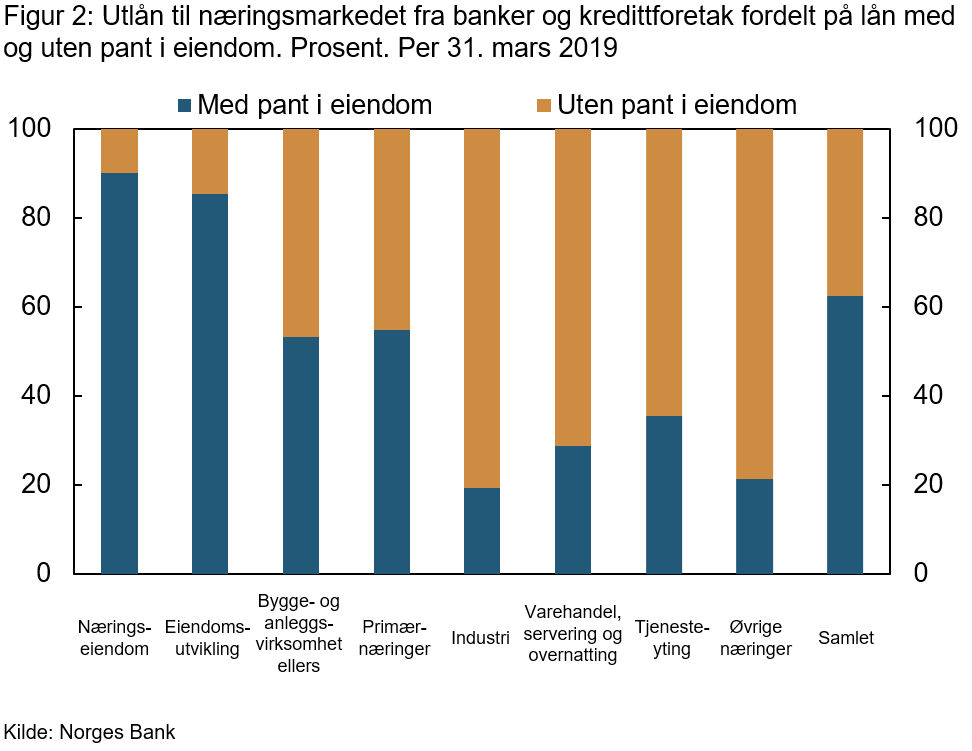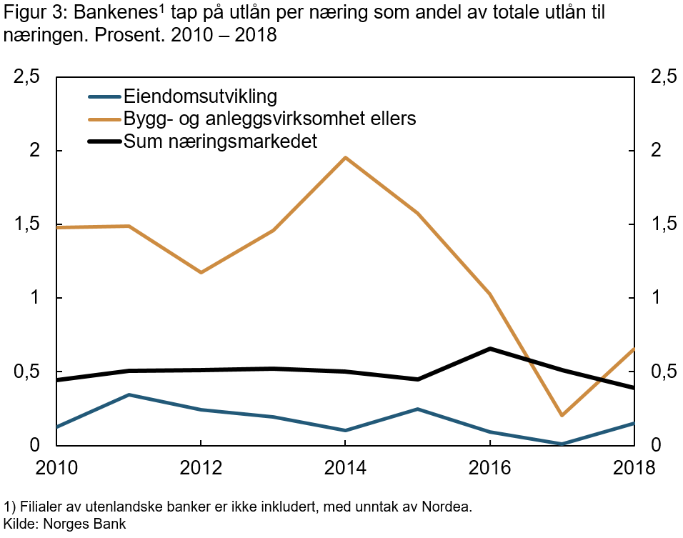 Av bankenes foretakskunder har eiendomsutviklere den nest høyeste andelen lån med pant i eiendom (etter næringseiendomsforetak), se figur 2. Bankenes tap på utlån til eiendomsutvikling har vært lave etter finanskrisen, se figur 3. Tap på utlån til annen bygg- og anleggsvirksomhet har derimot vært relativt høy. Disse utlånstapene utgjør likevel kun en begrenset andel av bankenes totale tap, siden utlånene til næringen er små.