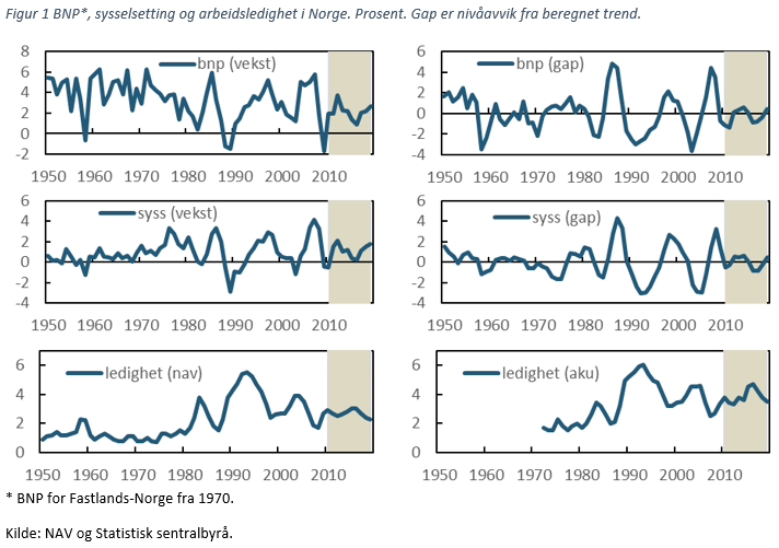 BNP-veksten i Norge varierte riktignok en del fra år til år også i første del av denne perioden, men ser vi på BNP på nivå som avvik fra en beregnet trend, det vi gjerne omtaler som et produksjonsgap, blir utslagene klart større fra rundt 1980. Det samme gjelder for sysselsettingen og arbeidsledigheten. Som figur 2 viser, ble den målte variasjonen i disse variablene markert høyere i perioden fra 1980 til 2010 enn i de foregående tiårene.