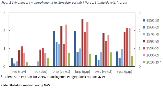 Siden 2010 har utslagene i produksjon og sysselsetting igjen vært mindre. Standardavviket til BNP-veksten dette tiåret ligger an til bli den klart laveste i etterkrigstiden, se figur 2, og for de andre størrelsene i figuren må vi minst tilbake til 1970-tallet for å finne et tiår med mindre variasjon. Den registrerte arbeidsledigheten, som beveget seg mellom en topp på nesten fire prosent og en bunn på godt under to prosent på 2000-tallet, har for eksempel holdt seg mellom to og tre prosent dette tiåret.