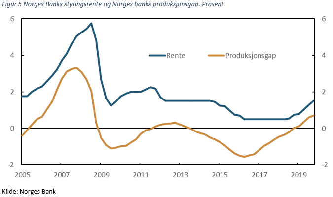 Også pengepolitikken har fungert som en støtdemper. En flytende valutakurs legger til rette for at pengepolitikken kan tilpasses innenlandske forhold, og siden midten av 2000-tallet har styringsrenten gjennomgående blitt satt opp i oppgangskonjunkturer og ned i nedgangskonjunkturer, se figur 5. Perioden siden oljeprisen falt i 2014 er det siste eksempelet på dette.