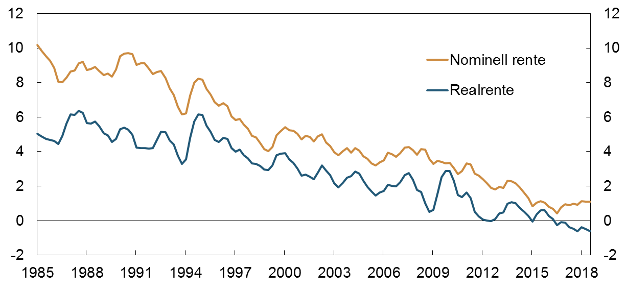 Kilde: OECD, tidligere brukt i Norges Bank Staff Memo No. 7 2018 Estimates of the neutral rate of interest in Norway av Leif Brubakk, Jon Ellingsen og Ørjan Robstad