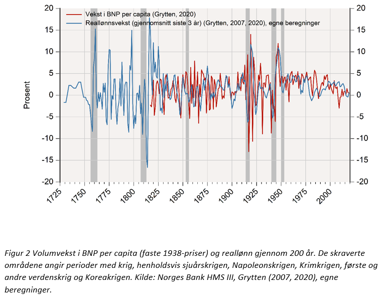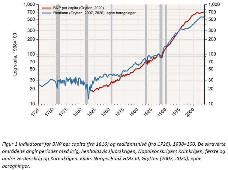 [2] Tallmaterialet i denne databasen bygger på Norges Banks prosjekt Historisk Monetær Statistikk (HMS) og jubileumsbokprosjektene. I HMS-prosjektet har vi gjennom en årrekke samarbeidet med professorene Jan Tore Klovland og Ola Honningdal Grytten ved Norges Handelshøyskole. Nye og reviderte tall for BNP er nylig utarbeidet av professor Ola Grytten (se Grytten, 2015, 2020b). HMS-prosjektet har også gitt oss nye kunnskaper og reviderte tall for den historiske utviklingen i levekostnadsindekser, konsumprisindekser og engrosprisindekser som strekker seg helt tilbake til 1492 (se Klovland, 2013 og Grytten, 2020a). I beregningene av tallene for gjennomsnittlig reallønn som presenteres i dette notatet har vi supplert kunnskapene om den historiske utviklingen i Norge tidlig på 1800-tallet, i perioden rundt Napoleonskrigen, med hva vi vet om utviklingen i vårt naboland Danmark i denne perioden basert på en artikkel av Abildgren (2017) [referanseliste]. Hele tallmaterialet blir beskrevet i en kommende skriftserie fra Norges Bank, som, i likhet med de to tidligere bøkene i HMS-prosjektet, redigeres av undertegnede i samarbeid med Jan Tore Klovland og Jan Fredrik Qvigstad.