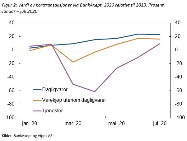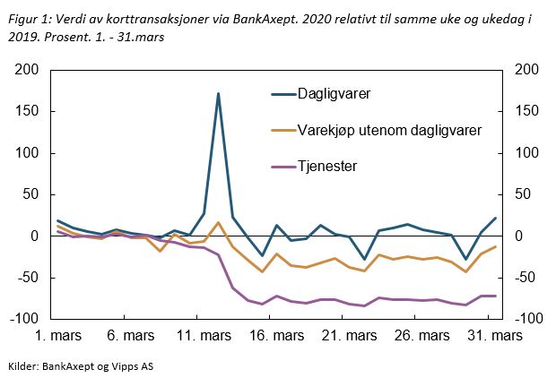 Korttransaksjonene viser at husholdningenes forbruk falt markert etter de kraftige smitteverntiltakene ble innført 12. mars, se figur 1. Nedgangen var sterkest for kjøp av tjenester ettersom mange tjenesteytende næringer ble stengt eller måtte redusere sitt tilbud betydelig på grunn av de omfattende smittevernstiltakene. Dette omfattet mange tjenester som typisk blir betalt med kort, som hotell, restauranter, frisører og transport- og helsetjenester. Kjøp av tjenester avtok noe allerede før tiltakene ble iverksatt, men falt kraftig da tiltakene ble iverksatt og var i siste halvdel av mars 75 prosent lavere enn samme periode året før.