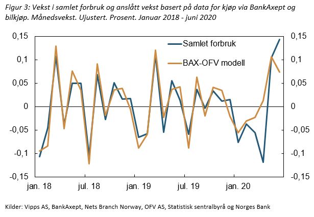 Kortdataene gir oss gode indikasjoner på hvordan husholdningenes forbruk har utviklet seg om lag halvannen måned før de tilsvarende nasjonalregnskapstallene publiseres. For å teste hvor godt dataene anslår konsumveksten har vi estimert enkle månedsmodeller for samlet konsum og for varekonsumet fra og med januar 2016, ved å kun benytte informasjon som var tilgjengelig på anslagstidspunktet. I tillegg til korttransaksjonsdata har vi inkludert månedsveksten i antall nyregistrerte biler fra Opplysningsrådet for veitrafikk (OFV AS), ettersom disse dataene i likhet med kortdataene er tilgjengelig ved månedsslutt. Historisk har bilkjøp endret seg mye under kriser og vært viktig for å forklare konsumendringene.