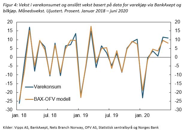 Anslag fra en enkel modell som inkluderer månedsveksten i varekjøp via BankAxept og bilregistreringer samsvarer historisk svært godt med utviklingen i varekonsumet, se figur 4. Modellen er også klart bedre enn enkle tidsseriemodeller.[2]