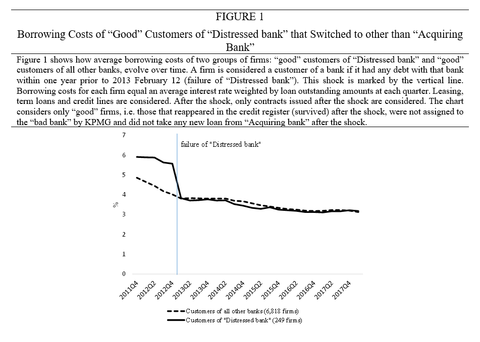 Firms avoid switching when it is costly, thus, it is difficult to observe switching costs in the data. In this blog, I look at forced switches, induced by bank closures, to provide a novel lower bound estimate of firms’ bank-switching costs. Lithuania offers an ideal setting for identification due to unexpected simultaneous closures of two banks, which I call “Distressed bank” and “Healthy bank”, and due to an exhaustive credit register, which reports interest rates and other characteristics of all outstanding loans in Lithuania. When a financially distressed bank was closed and its customers were forced to switch, their borrowing costs dropped immediately and converged to the rest of the market (see Figure 1). This suggests that the firms were locked-in and overcharged, and the fact that they paid the overcharge instead of switching suggests that switching costs were even larger than the overcharge. Hence, the overcharge, provides the lower bound estimate of switching costs.