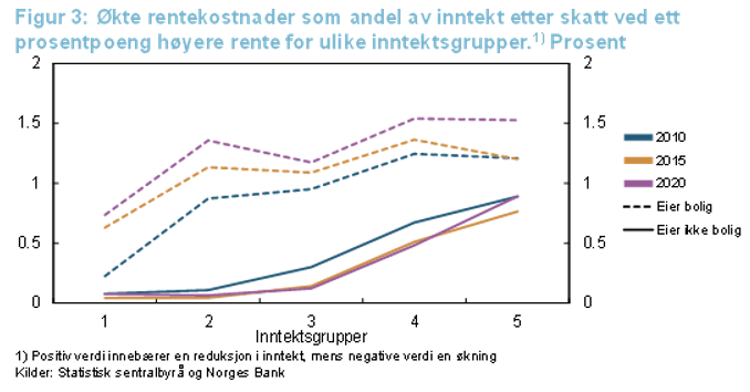 Tallene viser også ulik gjeldsutvikling over tid for de to gruppene. Husholdninger som ikke eier bolig har redusert sin gjeld som andel av inntekt etter skatt i perioden 2010 til 2020, mens de som eier bolig har økt sin gjeld som andel av inntekt. Blant boligeierne er det husholdningene med lavest inntekt som har hatt størst økning i gjeldsbelastningen over den samme perioden. Til tross for dette ville en renteøkning på en prosentenhet i 2020 redusert inntekten til boligeiere i den høyeste inntektsgruppen mer enn dobbelt så mye som boligeiere i den laveste inntektsgruppen.