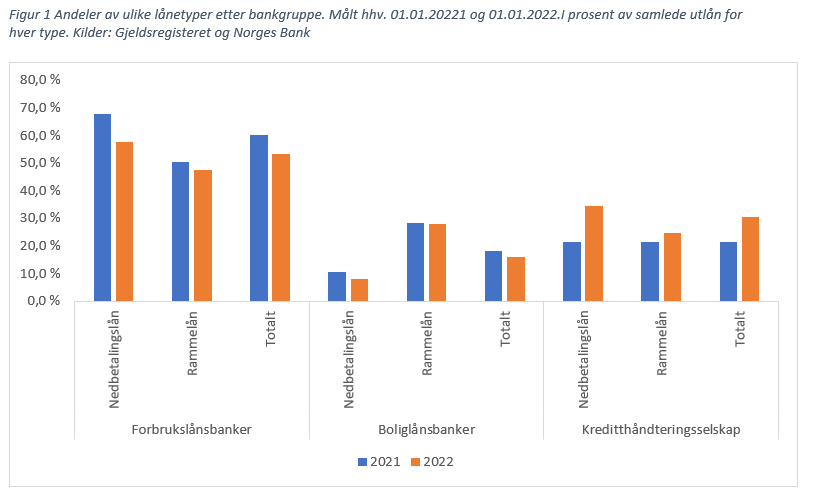 Samlet utestående rentebærende forbruksgjeld i norske husholdninger falt nesten 7 prosent i 2021. Samtidig har det vært en vridning i hvem som står som motpart – utlån fra bankene har falt markert, mens utlån som holdes av selskaper som håndterer dårlige lån har vokst. Særlig risikoutsatte lån utgjorde ved inngangen til 2022 over 52 prosent av utestående forbruksgjeld, en økning på over 4 prosentpoeng fra inngangen til 2021.