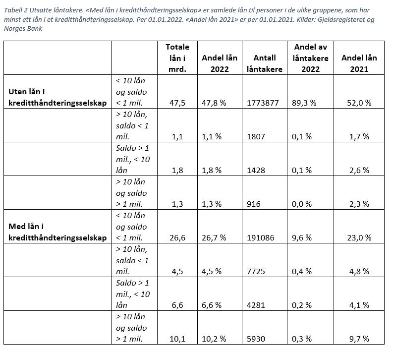 De aller fleste låntakerne – 89 prosent – er ikke i noen av disse gruppene, se tabell 2. Men selv om de er mange, holder de ved inngangen til 2022 bare 48 prosent av samlet forbruksgjeld. Det er 4 prosentpoeng mindre enn året før.