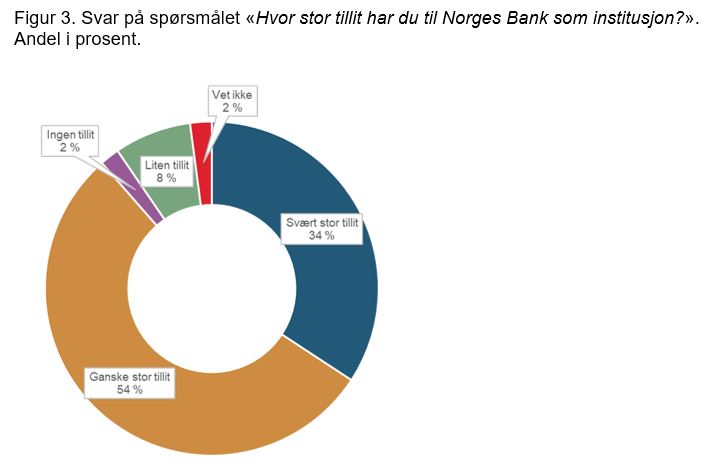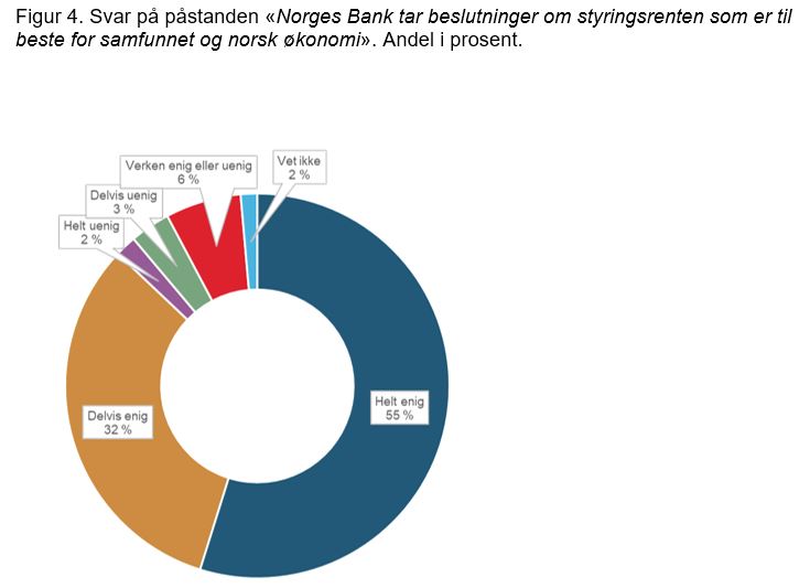 Helt til slutt i undersøkelsen ble det stilt noen spørsmål om tilliten til Norges Bank. Resultatene viser at folk har tillit til Norges Bank som institusjon, se figur 3. Det var også av interesse å finne ut hva folk mente om utøvelsen av pengepolitikken, se figur 4. Svært mange mente at Norges Bank tar beslutninger om styringsrenten som er til det beste for samfunnet og norsk økonomi. At det er høy grad av tillit mens det er mer begrenset kunnskap om oppgavene, er i tråd med tilsvarende undersøkelser av andre sentralbanker.
