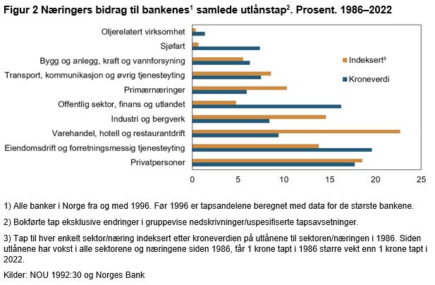 Beregnede tapsbidrag i kroner kan undervurdere bidrag fra næringer som hadde høye tapsandeler under bankkrisen, men lave tapsandeler etter bankkrisen. Siden 1986 har både prisene og bankenes utlån økt. Bankenes utlån i kroner er om lag 20 ganger høyere i dag enn i 1986. Vi beregner derfor indekserte bidrag som tar hensyn til endringer i kroneverdien på bankenes utlån. Med denne beregningen blir bidraget størst fra varehandel, hotell og restaurantdrift.