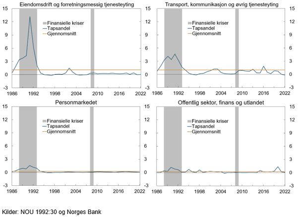 Tapsandelene økte særlig under bankkrisen i 1988–1993, se figur 4. Store investeringer og dårlig bankhåndverk før bankkrisen bidro til at flere foretak fikk problemer med å betale for seg da aktiviteten falt og rentenivået økte. Norges Bank beskrev bankenes kredittvurdering før bankkrisen i Penger og Kreditt 1988/3: «Bankers og finansieringsselskapers kredittvurdering av lånesøkere var i denne perioden ikke god nok, noe som i ettertid også erkjennes fra institusjonene selv». De påfølgende årene måtte bankene bokføre store tap på næringseiendomslån etter hvert som eiendommer ble stående tomme, eiendomspriser falt og kundene ikke klarte å betjene sine lån, se Kragh-Sørensen og Solheim (2014). Samlede tap på næringseiendomslån under bankkrisen utgjorde nesten en tredel av bankenes daværende utlån til næringen. Tapene økte også kraftig på lån til primærnæringene under bankkrisen. Overkapasitet og handelsrestriksjoner bidro til flere konkurser i oppdrettsnæringen, se NOU (1992). Overkapasitet og fallende etterspørsel bidro også til at bankene tapte en stor andel av sine utlån til varehandel, hotell og restaurant. Etter bankkrisen falt tapsandelene i alle næringsgruppene.