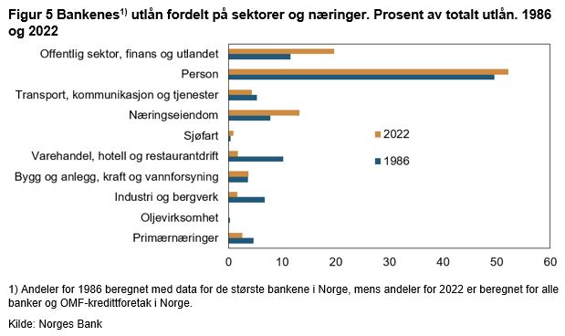 De lave tapsandelene etter finanskrisen kan skyldes flere forhold. Bankenes risikostyring har trolig blitt bedre. Erfaringer fra tidligere kriser, økt kompetanse, datatilfang, digitalisering og risikosensitivitet i kapitalkravene kan ha bidratt til bedre risikostyring. De lave tapene kan også forklares med historisk lave renter, lav arbeidsledighet og god inntektsvekst. I tillegg har trolig obligasjonsmarkedet finansiert en større del av de mest risikable foretakene. Siden 1986 har bankene vridd utlånene sine mot mindre tapsutsatte sektorer som personmarkedet, offentlig sektor og finans, se figur 5. Det har trolig gjort bankene mindre tapsutsatte.