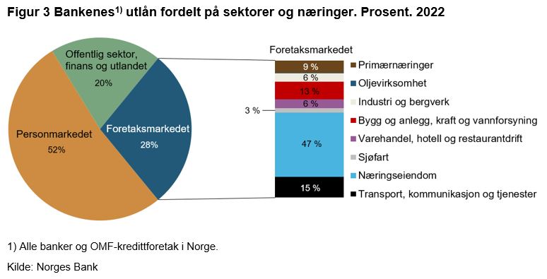 Næringseiendom har en lavere gjennomsnittlig tapsandel enn flere andre næringer, men næringseiendom er likevel den næringen som har påført bankene størst tap målt i kroner (se figur 2). Det skyldes at næringseiendom står for om lag halvparten av bankenes utlån til foretaksmarkedet (se figur 3). Økte tap på næringseiendomslån kan derfor svekke bankenes lønnsomhet kraftig.
