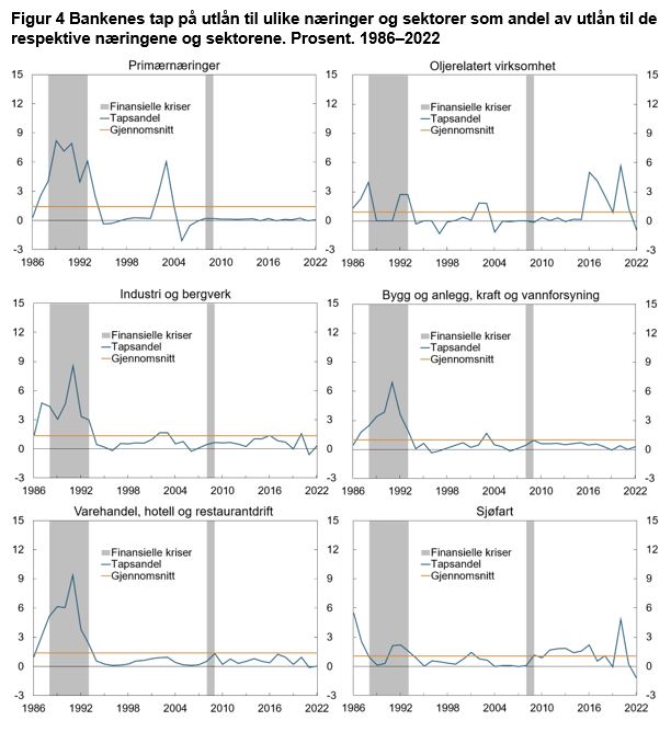 Tapsandelene økte mindre under den globale finanskrisen enn under lavkonjunkturårene 2002–2003. Men etter finanskrisen har tapsandelene vært høye på utlån til både sjøfart og oljerelatert virksomhet. Store investeringer og nedgang i verdenshandelen bidro til overkapasitet og økte tap i sjøfart etter finanskrisen. Tapene på oljerelaterte utlån var lave i flere år etter finanskrisen. Men høsten 2014 falt oljeprisen kraftig. Det skapte store utfordringer med lav etterspørsel for oljeleverandørindustrien, og tapsandelen på utlån til oljerelatert virksomhet økte til 5 prosent i 2016. Under pandemien falt verdenshandelen igjen, og tapsandelene økte på utlån til oljerelatert virksomhet og sjøfart. De andre næringene har ikke påført bankene store tap etter finanskrisen.