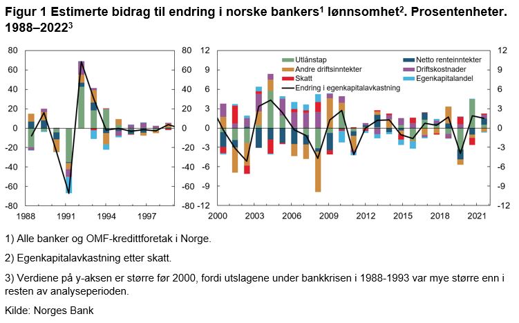 Utlånstap forklarer en stor del av endringene i norske bankers lønnsomhet, særlig under kriser. Under bankkrisen i 1988–1993 ble bankenes lønnsomhet svekket av høye utlånstap, se figur 1. I årene etter bankkrisen ble deler av tapene tilbakeført, fordi det viste seg at bankene hadde skrevet ned verdien på utlånene mer enn hva de endelige tapene skulle bli. Tilbakeføringene bidro til en kraftig resultatforbedring. Det samme var tilfelle under koronapandemien, men i mindre grad. Økte utlånstap trakk bankenes lønnsomhet ned i 2020, mens tilbakeføringer de påfølgende årene bidro til bedre lønnsomhet.