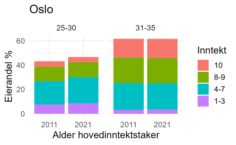 Det ser ikke ut til å ha skjedd. Sannsynligheten for at en husholdning i Oslo i aldersgruppen mellom 25 og 35 år eier sin egen bolig, er så godt som uendret fra 2011 til 2021. Om noe kjøper man bolig tidligere, med en litt høyere eierandel i gruppen fra 25-30 år, se figur 1. De med høy inntekt har mye større sannsynlighet for å eie egen bolig som unge, men forskjellen var om lag uendret fra 2011 til 2021. Også høy formue er en viktig indikator for om man kommer inn på boligmarkedet. Her ser vi at eierandelen har økt litt for de høyeste formuesgruppene relativt til de mindre velstående når vi ser på aldersgruppen mellom 31 og 35 i 2021, se figur 2. Hovedinntrykket er likevel at eierandelen har vært svært stabil over denne perioden.