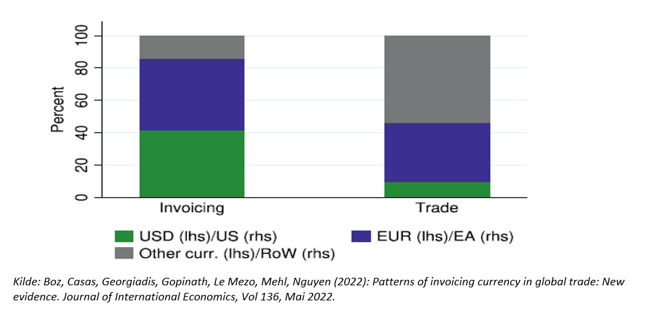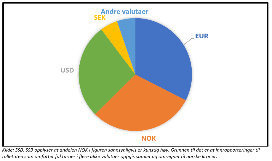 Godt i tråd med dette beskriver figur 2 at USD og euro er mye brukt som oppgjørsvaluta ved import til Norge. Prisen settes med andre ord som oftest ikke i norske kroner i de handlene vi gjør med andre land. Hvis importpriser i USD eller i euro i neste omgang hadde nådd helt ut til detaljhandelsnivå her i Norge, ville priser i kroner på varer som hadde høyt importinnhold beveget seg kontinuerlig i takt med valutakursen. Hvis dette gjaldt mange varer, ville norske kroner fungert dårlig som måleenhet og verdioppbevaring. Slik er det ikke: bedrifter stiller priser i norske kroner (og det er nok dessuten påkrevet i lys av markedsføringsloven), og det er i praksis treghet i hvor ofte prisene i kroner justeres (tregheten varierer på tvers av varer og over tid).