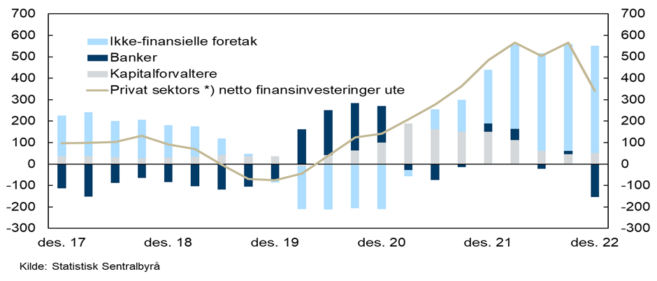 *) Privat sektors netto finansinvesteringer i utlandet er sum norske sektorer unntatt statsforvaltningen (transaksjoner) i prosent av BNP.