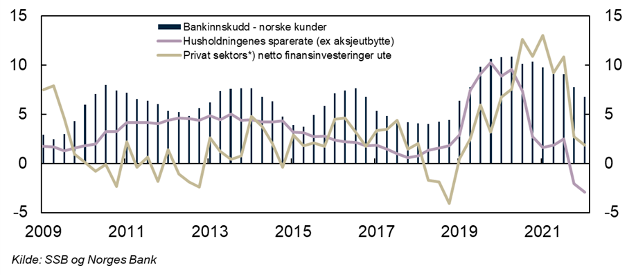 Figur 1: Bankinnskudd (årsvekst), husholdningenes sparerate og privat sektors* netto finansinvesteringer i utlandet. Glidende 3-kvartalers sentrert snitt. 2009-2022.