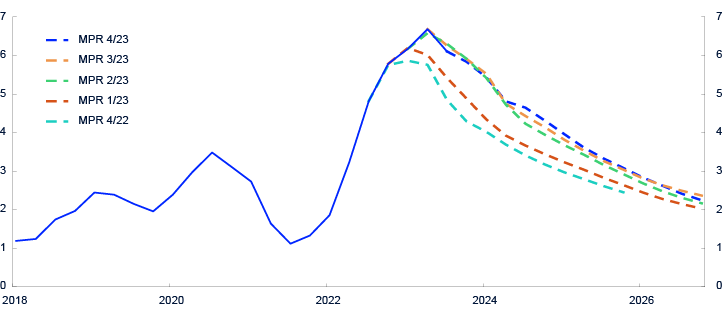The year 2023 was marked by continued high inflation and rising policy rates internationally. The krone depreciated further in 2023, particularly in the period to summer. Prices surged for both imported goods and domestically produced goods and services. To dampen the rise in prices, the Monetary Policy and Financial Stability Committee raised Norges Bank’s policy rate from 2.75% to 4.5% in the course of the year. See the Norges Bank’s Monetary Policy and Financial Stability Committee for further information.