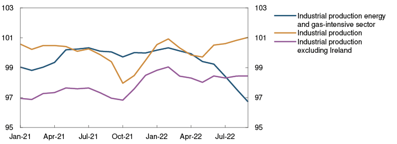1 Period: January 2021 – September 2022. Energy- and gas-intensive sectors comprise mining and quarrying, manufacture of basic metals and fabricated metal products, except machinery and equipment, manufacture of rubber, plastic products and other non-metallic mineral products, manufacture of wood, paper, printing and reproduction of recorded media, manufacture of chemicals and chemical products and manufacture of coke and refined petroleum products. Weighted by share of total industry added value in 2019.