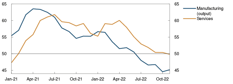 Consumer price inflation is very high. In addition, many central banks have raised their policy rates substantially since spring, and market policy rate expectations indicate further rate hikes in the period to summer 2023 in both Europe and the US. Households are expected to reduce saving further, but consumption in Europe will likely decline in the coming quarters due to the high cost of living. Activity indicators for manufacturing and services are low (Chart 1.2), and investment is expected to decline ahead. These factors combined imply a likely decline in European economic activity through autumn and winter. In addition, lockdowns related to higher Covid infection rates will dampen growth in China.