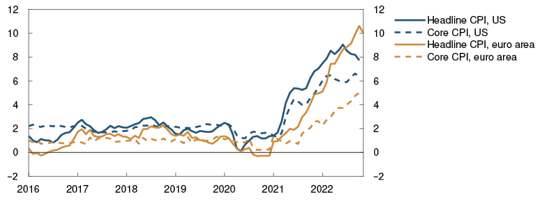 Pandemic-related supply and demand conditions and the war in Ukraine have contributed to high inflation among Norway’s main trading partners since autumn 2021, but consumer price inflation may now have passed the peak in some countries, such as the US. In the US, 12-month CPI inflation fell somewhat in recent months, while core CPI inflation has run slightly above 6% (Chart 1.4). In the euro area, headline inflation slowed to 10% from October to November 2022. Both energy and food price inflation is high. Underlying consumer price inflation was 5% in November. In recent months, underlying inflation among trading partners has been higher than projected in the September Report, particularly in Europe.