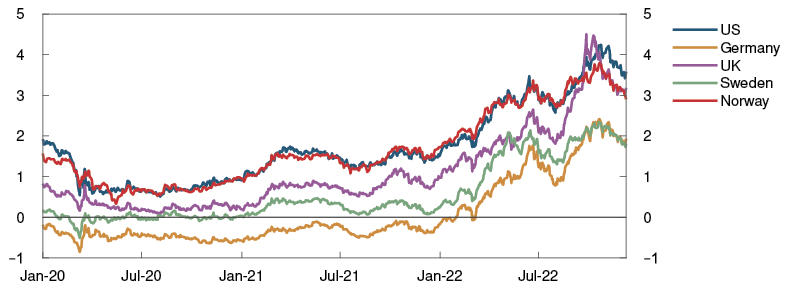 Since the September Report, central banks abroad have continued to tighten monetary policy, primarily in response to high inflation. Central banks in the US, euro area, UK and Sweden have all raised their policy rates, which are now at their highest levels since the financial crisis. The market’s policy rate expectations for the coming period have risen slightly since the September Report. At the same time, forward rates indicate expectations of a slower pace of increase in policy rates in the coming year, which also reflects what most central banks have signalled.