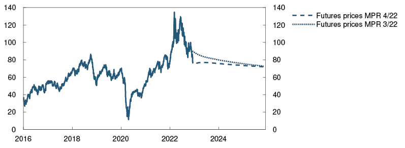 Labour markets are tight, but the fall in unemployment appears to have come to a halt in a number of countries and labour demand appears to be declining in both the US and Europe. Wage growth among Norway’s main trading partners is projected to be about 4.5% in both 2022 and 2023, slowing gradually thereafter. Long-term market-based inflation expectations are little changed since the September Report and are close to the inflation targets of both the US and the euro area. Underlying consumer price inflation for trading partners as a whole is projected to slow from 4.8% in 2022 to slightly above 4% in 2023, before gradually drifting down to around 2%. The projections have been revised up from the September Report.