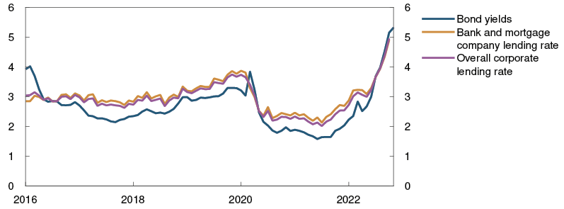 The krone exchange rate has fluctuated considerably in recent months but is now broadly in line with the projections in the September Report. The volatility in financial markets is adding to the uncertainty about movements in the krone exchange rate ahead. The expected path of Norway’s policy rate has fallen since September. Higher money market premiums have pushed up corporate borrowing costs. The rise in mortgage lending rates has been broadly as expected.