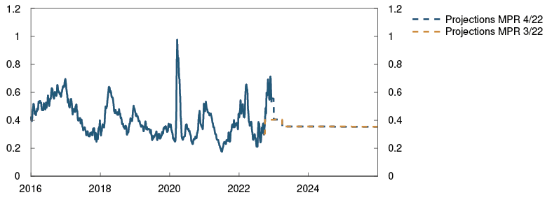 Consumer price inflation is very high in many countries. European gas and electricity prices remain at high levels, but futures prices for the coming year are lower than in September. The high level of inflation is reducing household purchasing power. Trading partner GDP growth is expected to be low in 2023. The projection has been revised down since the September 2022 Monetary Policy Report. The high degree of financial market volatility has persisted since September. Market forward rates indicate that policy rate expectations for the period ahead are slightly higher than in September and that central banks will gradually slow the pace of monetary policy tightening.