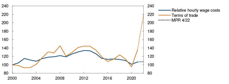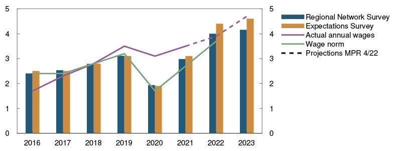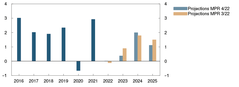 Wage growth is set to be higher in 2022 than in 2021, partly reflecting labour market tightness. Register-based wage statistics indicate that wage growth in the first three quarters of 2022 may have been slightly lower than projected. The projection for wage growth in 2022 has been revised down to 3.9%, implying a sharp decline in real wages. Norges Bank’s Expectations Survey indicates that wage growth expectations for 2023 have increased since September and nominal wage growth is expected to show a marked increase in 2023.
