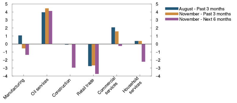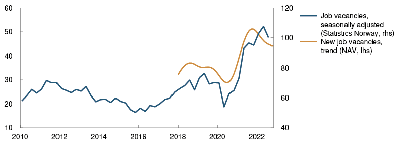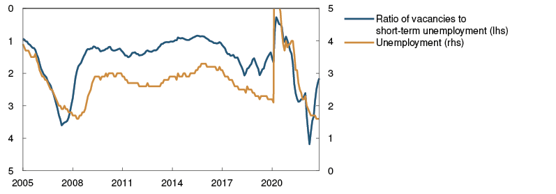 The labour market is tight. Employment has continued to rise, and unemployment has remained very low. Seasonally adjusted registered unemployment was 1.6% in November, which was slightly lower than projected in the September Report. There are still considerable labour shortages, but shortages are easing. The share of enterprises in Norges Bank’s Regional Network reporting that labour shortages are limiting output fell further in November. The number of job vacancies has also decreased.