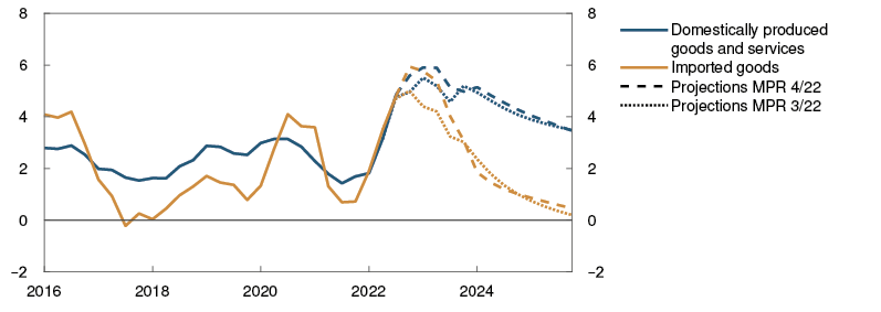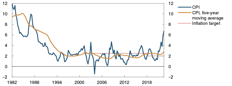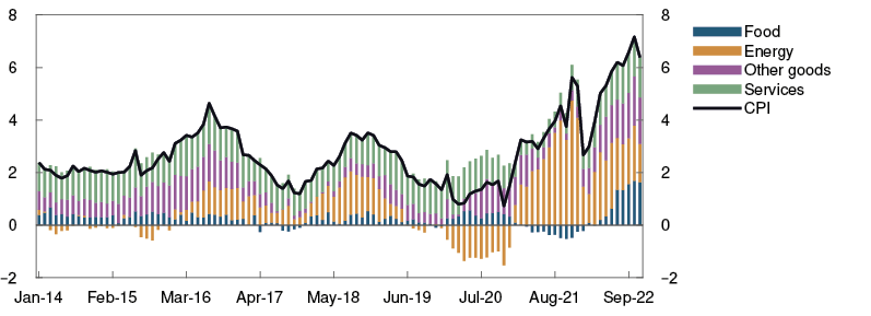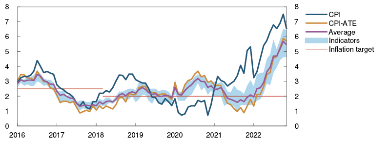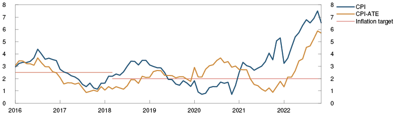 Inflation in Norway is high and appreciably higher than projected in the September Report. In November, the 12-month rise in the consumer price index (CPI) was 6.5%. Energy and food prices in particular have risen sharply over the past year, but prices across a range of other goods and services have also risen more than normal. The 12-month rise in the consumer price index adjusted for tax changes and excluding energy products (CPI-ATE) has moved up and stood at 5.7% in November. Prices for both imported goods and domestically produced goods and services are rising at a fast pace. Other indicators of underlying inflation have also edged higher. Inflation is expected to remain higher in the period ahead than previously projected.